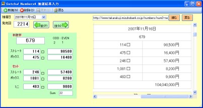 抽選結果登録 右側にはみずほ銀行のナンバーズ4当選結果が表示されます(ネットに接続出来る環境が必要です) 最新の抽選結果の追加更新は現在マニュアル入力のみ 抽選回が抜けると予想数字にも影響しますので、抜かさない様に ![]() "新規”ボタン。。。新しい抽選結果を登録するときにクリック