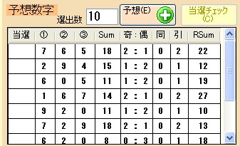 - ”予想”ボタン。。。押すと設定条件に基づいた予想数字を一覧表示します