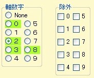 軸数字。。。当選数字に含める数字1個選択します。無条件(起動時)の場合は、”None”を選びます