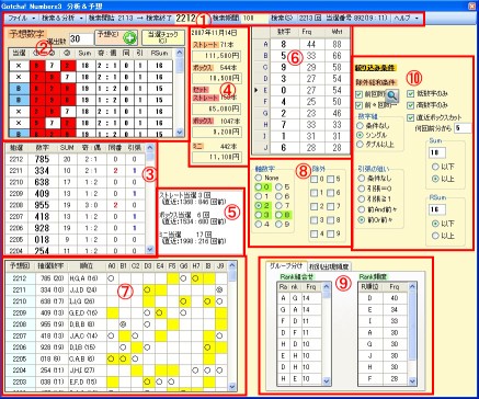 除外。。。予想数字に含めない数字を複数選択できます(起動時、全数字空欄)