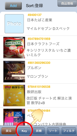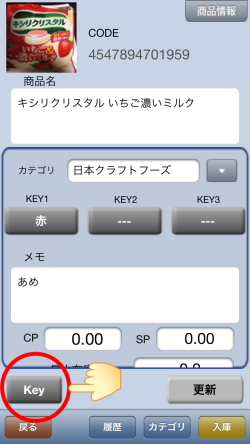 | 商品情報の入力、編集画面の下に”Key”ボタンがあります。 これをタップすると |
