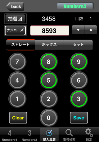 - ナンバーズ3と4の購入記録機能。当選判定でチェックも楽