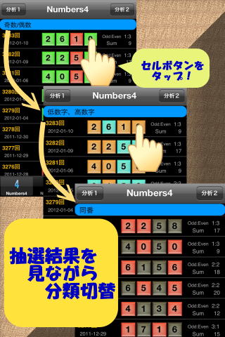 - 抽選結果一覧のセルボタンをタップするだけで、数字の分類表示切り替え(Ver.2.0から)
