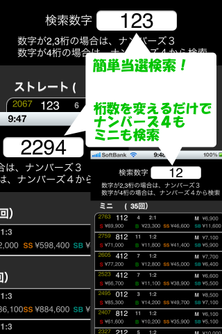 - ミニ、ナンバーズ3、ナンバーズ4の当選結果を同じ画面で検索できる当選検索