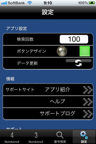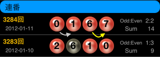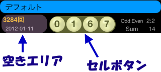 ナンバーズ4、3の抽選結果から指定回数のみ 取得します 初回起動時は、左の○タイプ 選択されている方が緑です 抽選結果一覧表示のセルボタンのデザインを変えます 通常、抽選結果一覧を開いた時に最新の結果を取得しようとしますが、 マニュアル操作で更新したい時に押します |