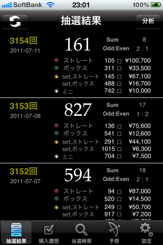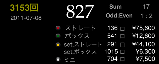 当選番号 その右の”Sum” = 3数字の合計値、”Odd:Even” = 奇数と偶数の組合わせ
