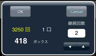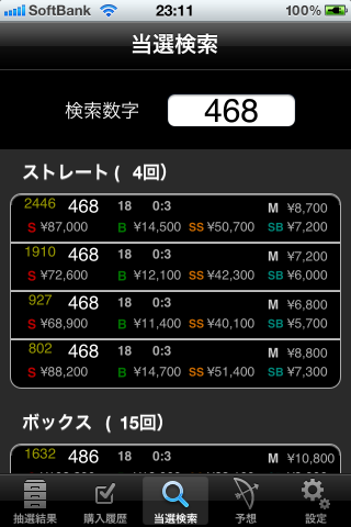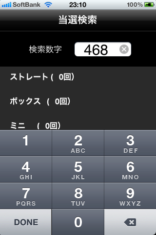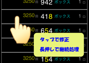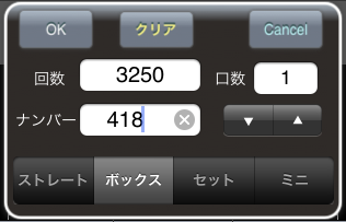 セルをタップ。 入力画面が表示されますので、必要な箇所を修正したら ”OK”ボタンを押して、更新。”追加”処理と同じく”Cancel”で抜けてください 当選検索★ 当選検索ビュー 直近抽選結果から指定回分の集計結果です