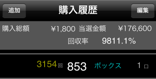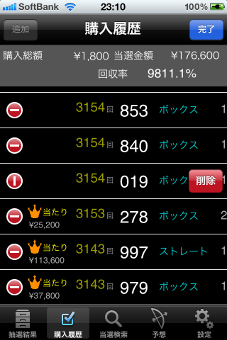指定回数の投票をマニュアルで入力、保存出来ます 抽選結果があれば、購入履歴と照合して当選判定を行います 購入金額、当選金額を集計し、回収率として表示します