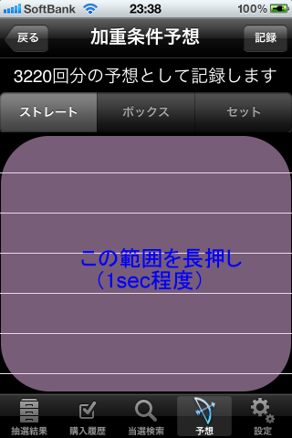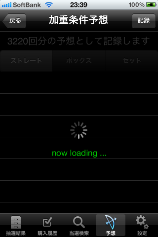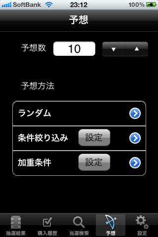 得られた数字を、直接購入記録へ転送する機能があります ※”ランダム” < ”絞り込み条件” < ”加重条件”の順に処理時間が掛かります ※”設定”ビューで設定した表示回数が多いと処理時間が掛かります(”絞り込み条件”、”加重条件”の場合) ※予想選択ビューで設定した予想数が多いと処理時間が掛かります