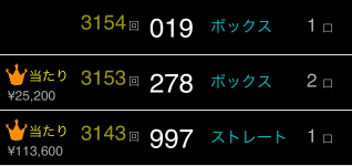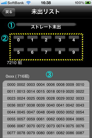 表示内容は 左上から、抽選回、当選番号、3数字の和(画像では、18)、奇数/偶数比(画像では0:3) 賞金額は、S=ストレート、B=ボックス、SS=セットストレート、SB=セットボックス、M=ミニ ★ 未出リスト (Ver.1.7から) 第1回の結果から、未だに出現していない数字のリストです