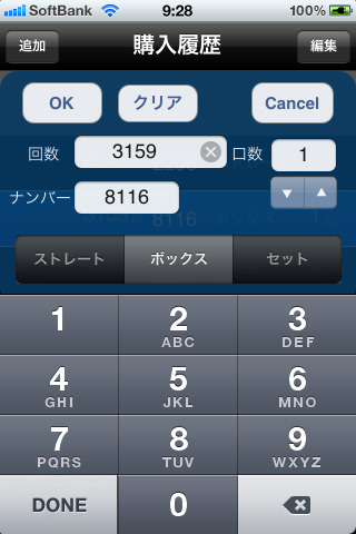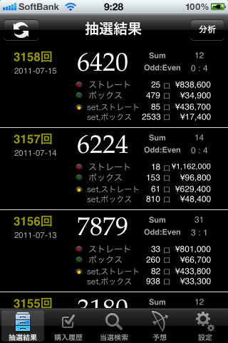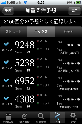 加重条件 。。。過去の結果を基に独自のアルゴリズムで数字をランク付けします。このランクと”条件絞り込み”設定にマッチした数字組を選出 - 購入記録機能。マニュアル入力、予想数字から直接記録。新しい抽選結果を入手したら即記録と照合し、当選をチェック